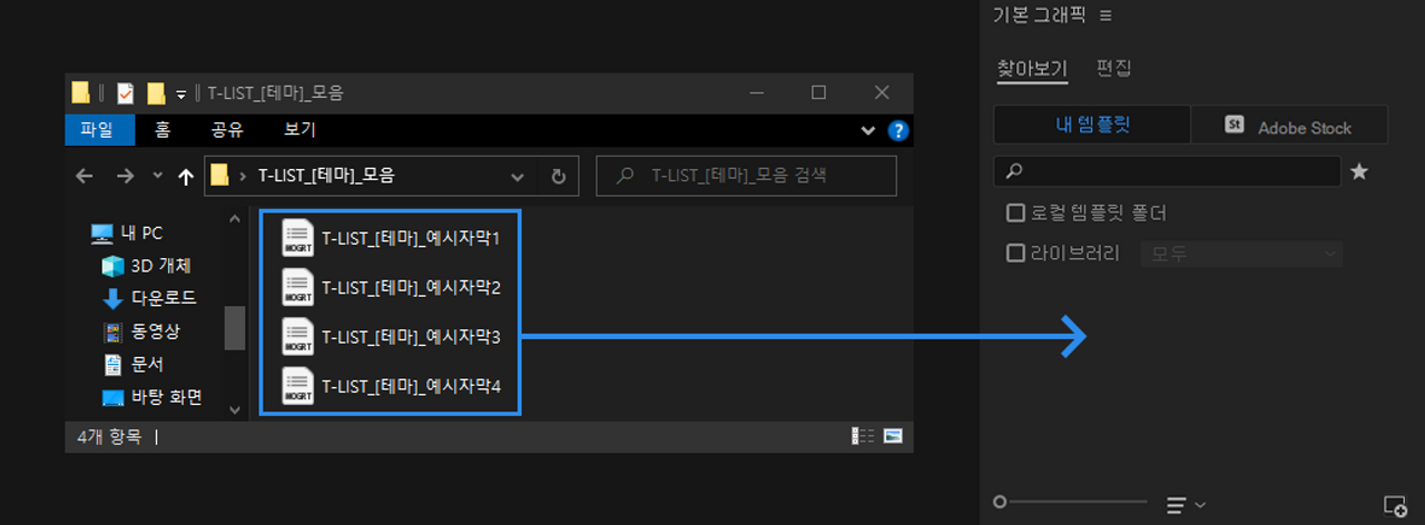 3️⃣ 프리미어의 메뉴 창 → 기본 그래픽 클릭 후 찾아보기 → 내 템플릿 선택 후 우측 하단 아이콘 클릭하기